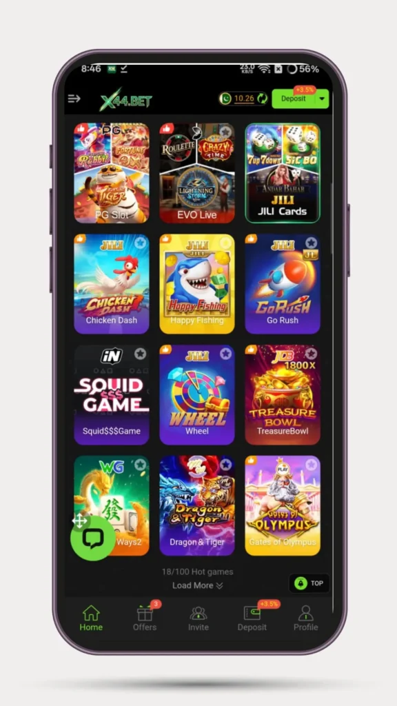 X44Bet Game is a mobile-focused online gaming platform offering a variety of casino-style games. Players can participate in card games like Teen Patti, Poker, and Rummy, as well as luck-based games like Dragon Tiger and slot machines. The app allows users to bet real money and earn rewards through both skill and chance-based games.