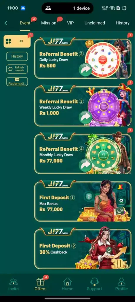 JJ77 Game frequently offers bonuses, daily rewards, and referral incentives. These features give players extra balance, more playing chances, and encourage continuous engagement.